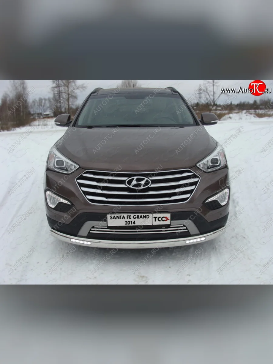 Защита передняя нижняя овальная с ходовыми огнями 75х42 мм ТСС Тюнинг Hyundai Grand Santa Fe (2013-2016) 1 DM (нержавейка) в Владивостоке Приморском крае